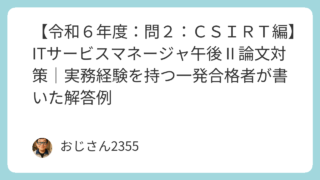 令和6年度 ITサービスマネージャ試験 午後Ⅱ(問1)のISPをテーマにしたサンプル解答を掲載。実務経験者が実際にまとめた合格レベルの論文例で、試験対策や答案作成の参考に役立ちます。