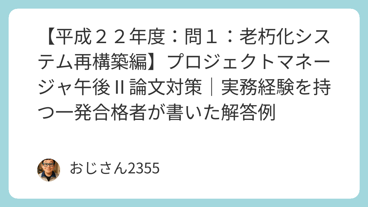 プロジェクトマネージャ試験の午後Ⅱの小論文を作成してみました。小論文のネタ探しや午後Ⅱ対策の参考にしてもらえるとうれしいです。