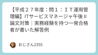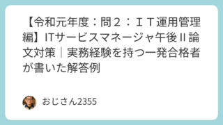 令和元年度 ITサービスマネージャ試験 午後Ⅱ(問2)のIT運用管理をテーマにしたサンプル解答を掲載。実務経験者が実際にまとめた合格レベルの論文例で、試験対策や答案作成の参考に役立ちます。