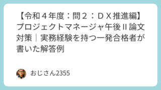 プロジェクトマネージャ試験 【令和4年度:問2:DX推進編】プロジェクトマネージャ午後Ⅱ論文対策|実務経験を持つ一発合格者が書いた解答例 令和4年度 プロジェクトマネージャ試験 午後Ⅱ(問2)のDX推進をテーマにしたサンプル解答を掲載。実務経験者が実際にまとめた合格レベルの論文例で、試験対策や答案作成の参考に役立ちます。 2025.08.14 2025.08.21 プロジェクトマネージャ試験