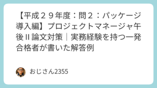 プロジェクトマネージャ試験 【平成29年度:問2:パッケージ導入編】プロジェクトマネージャ午後Ⅱ論文対策|実務経験を持つ一発合格者が書いた解答例 平成29年度 プロジェクトマネージャ試験 午後Ⅱ(問2)のパッケージ導入をテーマにしたサンプル解答を掲載。実務経験者が実際にまとめた合格レベルの論文例で、試験対策や答案作成の参考に役立ちます。 2021.08.29 プロジェクトマネージャ試験
