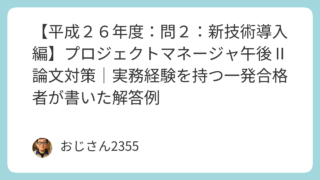 プロジェクトマネージャ試験 【平成23年度:問1:新技術導入編】プロジェクトマネージャ午後Ⅱ論文対策|実務経験を持つ一発合格者が書いた解答例 平成23年度 プロジェクトマネージャ試験 午後Ⅱ(問1)の新技術導入をテーマにしたサンプル解答を掲載。実務経験者が実際にまとめた合格レベルの論文例で、試験対策や答案作成の参考に役立ちます。 2021.05.19 2025.08.23 プロジェクトマネージャ試験